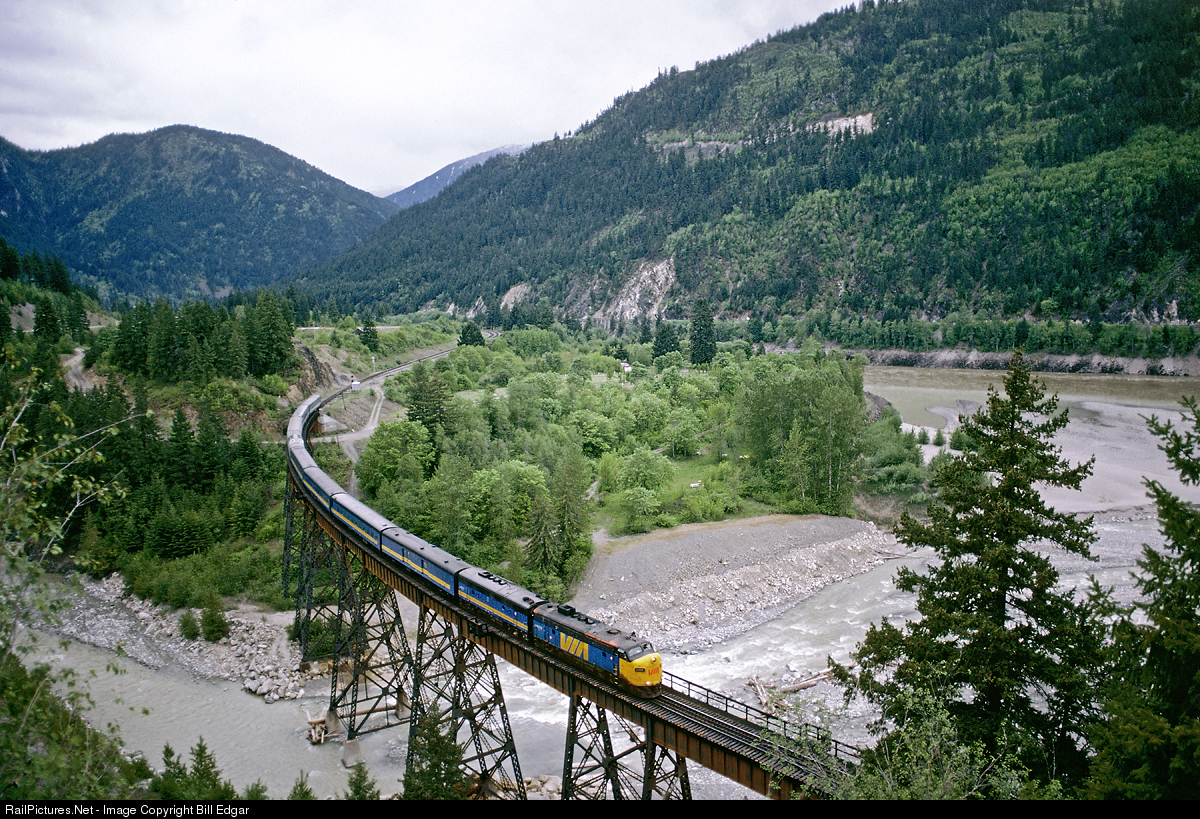 The Super Continental under VIA management crosses the Anderson River bridge as the train approaches Boston Bar, BC for a passenger stop and head end crew change.
